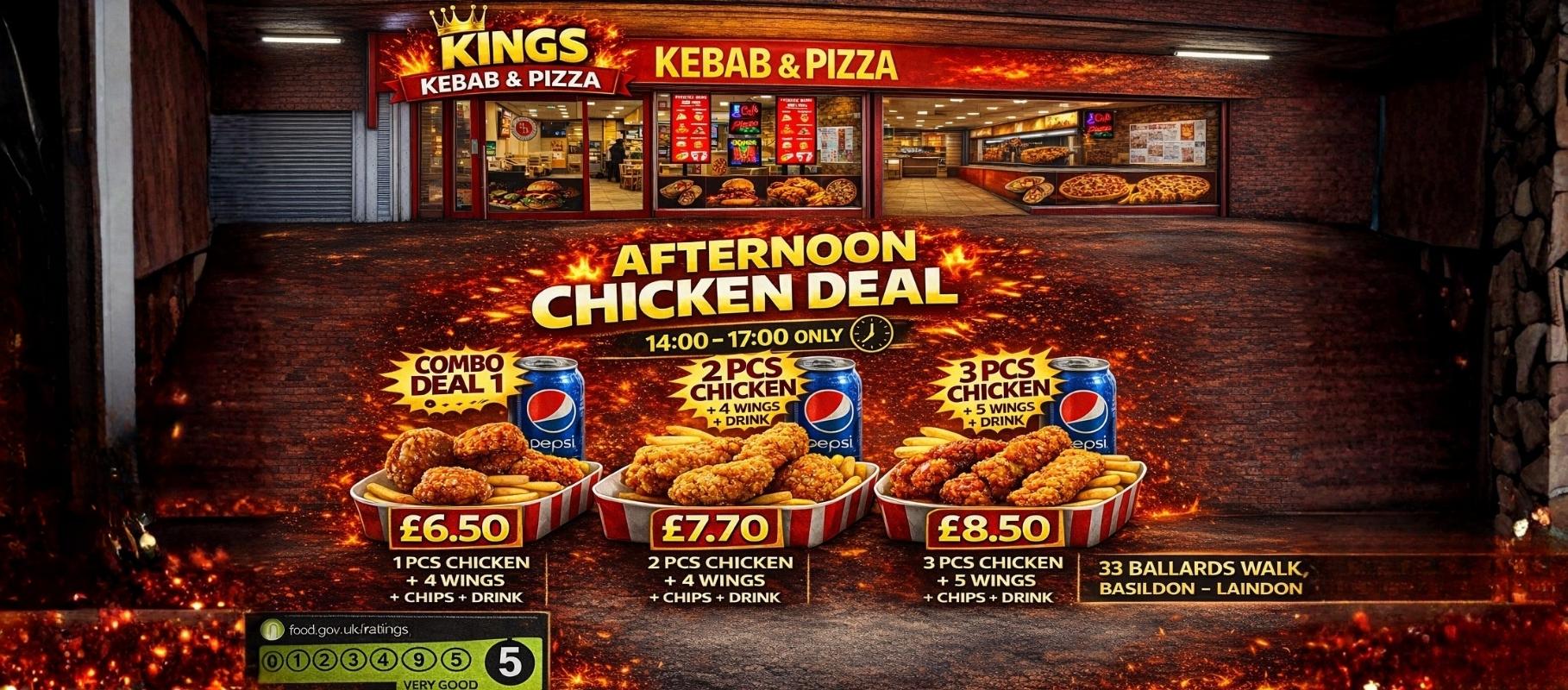 Welcome to the official website Kings Chicken Pizzeria ! On our website you will find our complete takeaway menu, always up to date with the latest prices and choices, including our special offer meal deals. Our website is easy to order from for collection or delivery! Simply choose your items and add them to your basket, then checkout!